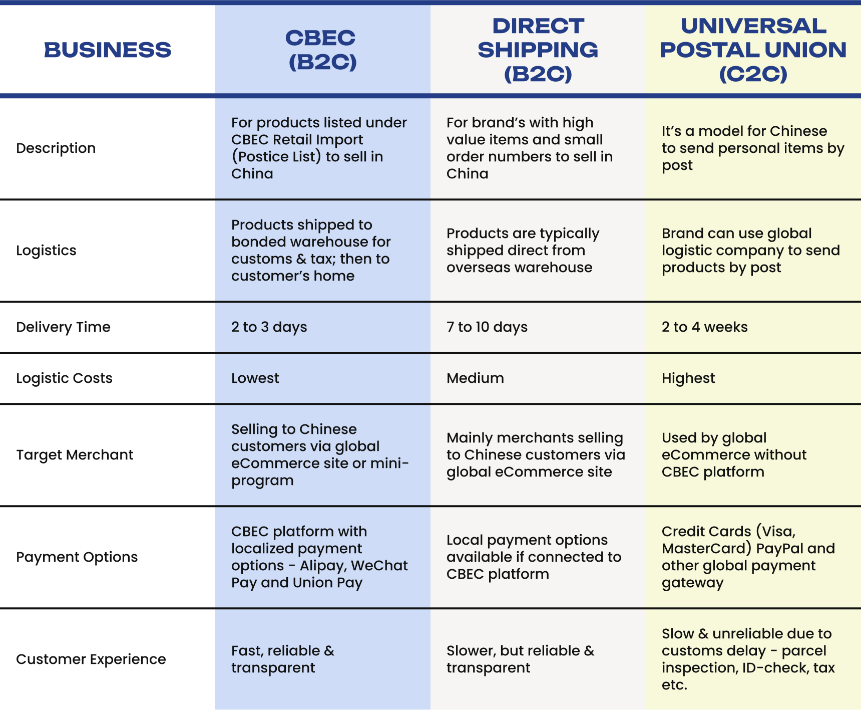 While we do not recommend companies using Universal Postal Union, since this is not an official shipping channel for ecommerce business, choosing the right CBEC model with China bonded warehouse or direct shipping from overseas warehouse will depend on several factors including the type, weight and value of products.