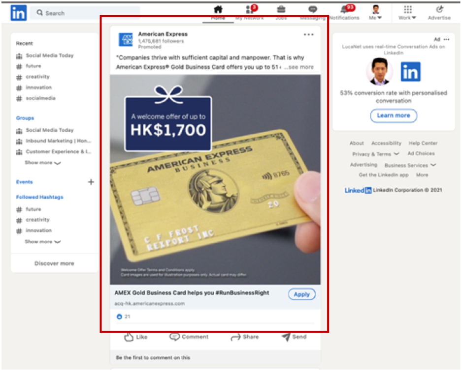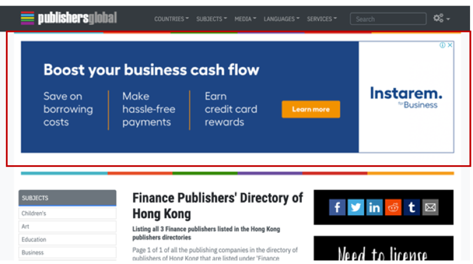 - Based on keyword targeting, run ads on websites that are relevant to the publisher’s content. Consider direct B2B publisher advertising—buying ads directly from trade publications gives you access to first party data and sometimes also includes their email database, which broadens your target audience. An example below shows Instarem, a financial services brand, has a display ad appearing in a publication where the keyword “finance” is in the headline of the related article.