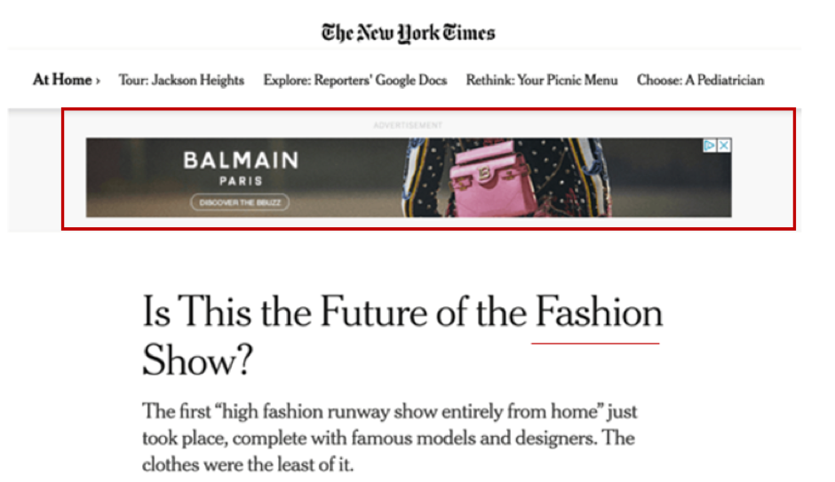 Another keyword targeting example shows luxury brand Pierre Balmain’s banner ad appearing in New York Times with a keyword “fashion” appearing in the headlines of the article.