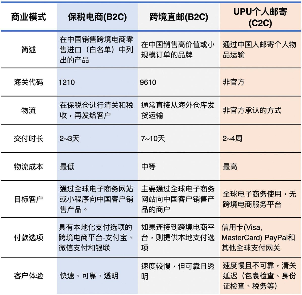 我们不建议您的跨境电商公司使用个人邮寄模式(UPU),因为这不是跨境电子商务的官方运输渠道。建议您根据产品的类型、重量和价值,选择中国跨境电商中被广泛应用的保税仓或从海外仓库直接发货的模式 。